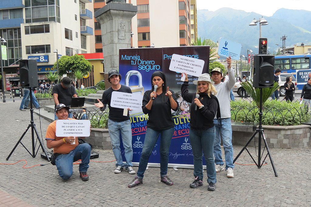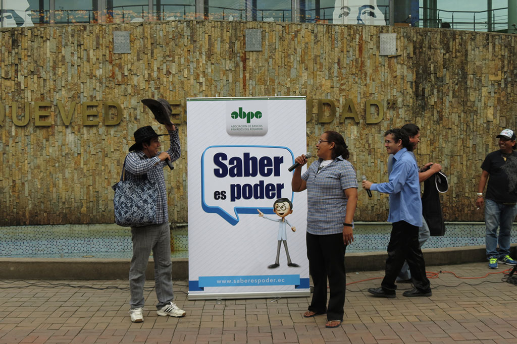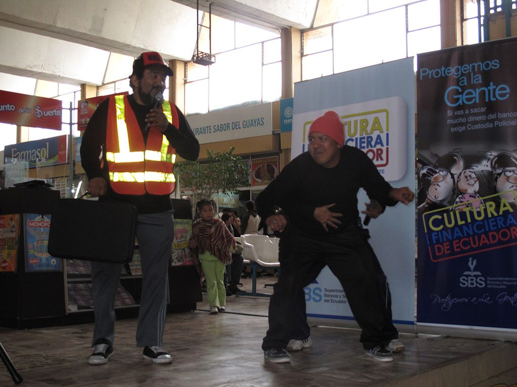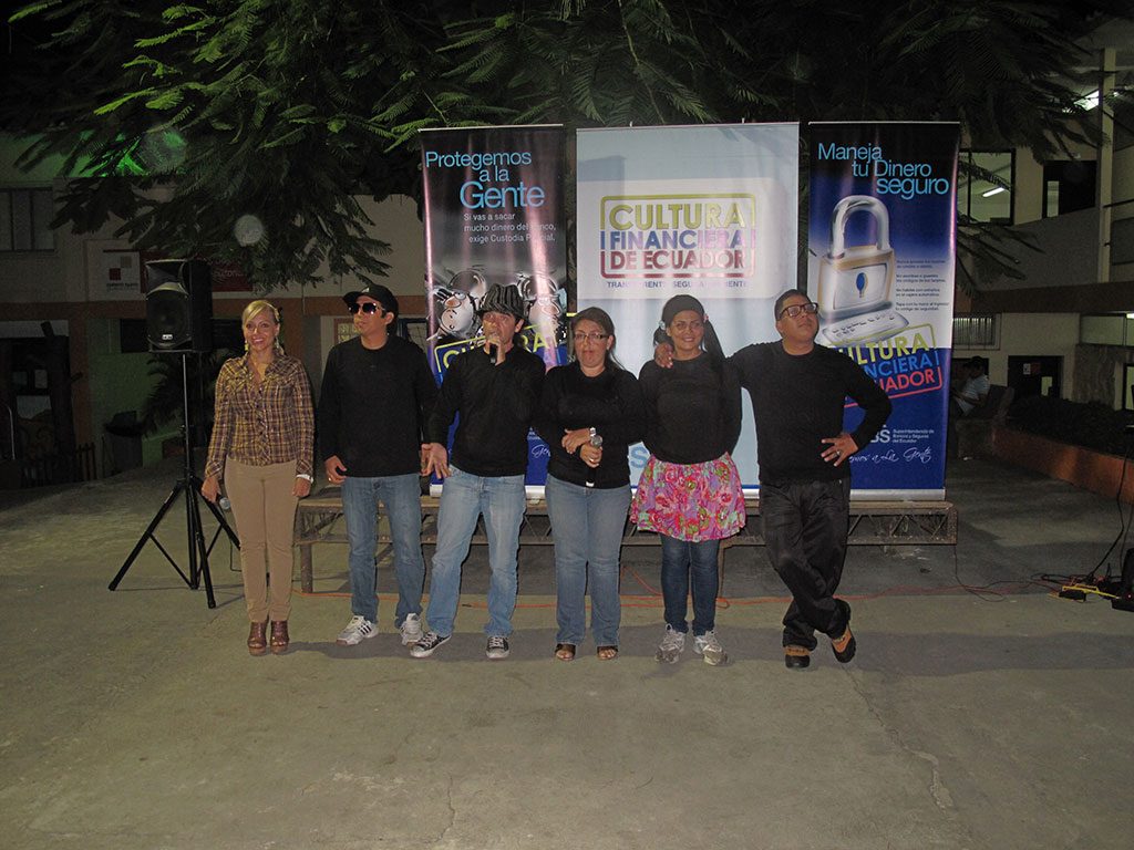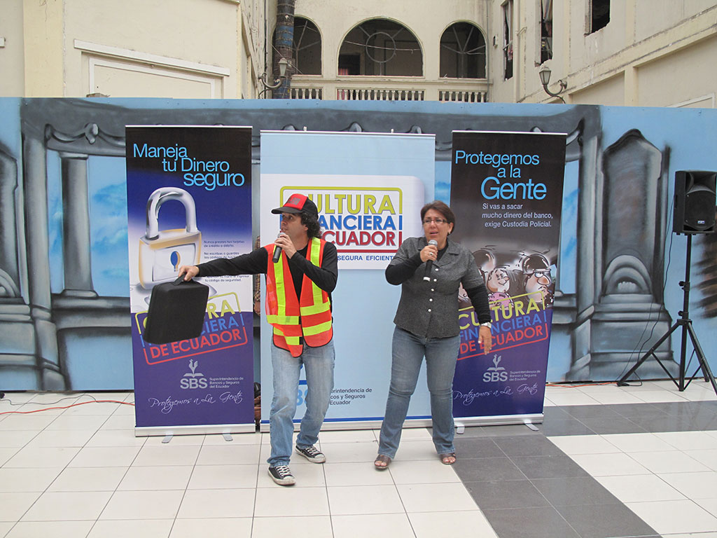 Como parte de una gran campaña nacional sobre educación financiera, utilizando todos los elementos comunicacionales, el teatro lúdico itinerante cumplió un papel fundamental, en tres etapas recorrimos el territorio nacional visitando universidades, colegios, centros comerciales, plazas, malecones y todo lugar de gran afluencia, con la finalidad de enseñar o recordar a la comunidad en correcto y buen uso de los cheques, tarjetas de crédito, seguridad policial para depósitos y todas las herramientas financieras de la que el ciudadano común hace uso, además de incentivar a la responsabilidad respecto del sobre endeudamiento, la utilería fue muy graciosa y los guiones en los diversos temas muy didácticos sin dejar lo divertido, logrando penetrar en el inconsciente de púbico espectador que recibió los mensajes con gran agrado.